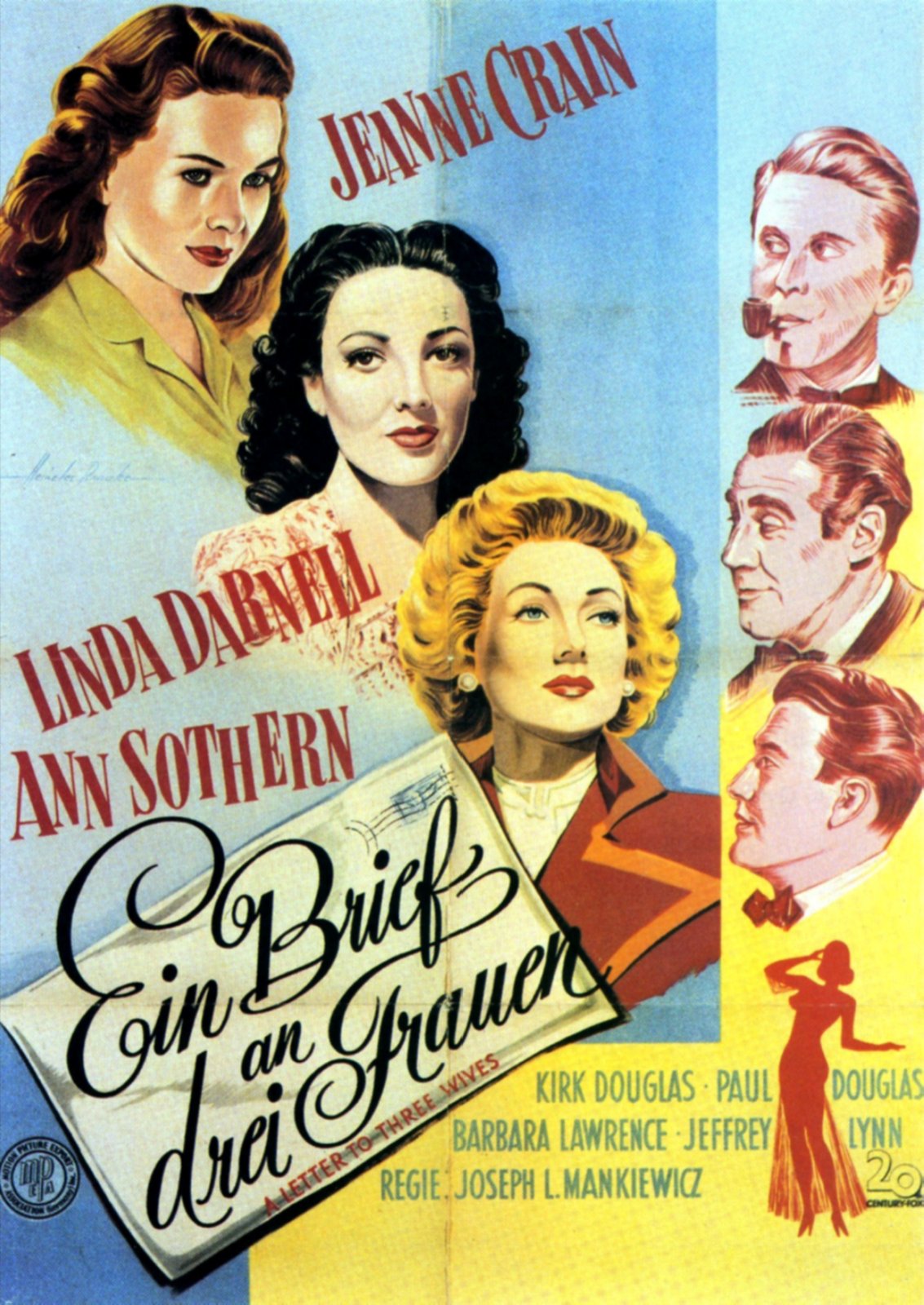 As Deborah Bishop (Jeanne Crain), Lora May Hollingsway (Linda Darnell), and Rita Phipps (Ann Sothern) are about to leave on a charity boat ride, a young man delivers A Letter to Three Wives (1949). The letter informs them that their "friend", Addie Ross (voiced with just the right amount of venom by Celeste Holm) has left town - with one of their husbands. Unable to leave the boat, the women spend the day worrying about their husbands and reviewing their marriages. Based on A Letter to Fives Wives by John Klempner (the film eliminated two wives, which tightens it up), this is an exceptional film, especially given that it is really a series of vignettes. The use of Addie's narration as a glue to hold together this tale of three marriages in trouble is both inspired and entertaining. That narration brings the tale to a different level, making the film a fully cohesive unit instead of a series of short stories. Two of the stories especially stand out. Rita and George Phipps (Kirk Douglas) are a relatively happy couple, but Rita, a successful radio writer, is trying to have it all - career, husband, and children. She's pretty good at doing it, but George is frustrated that he and their twins often take second place to the demands of her clients (ably represented by Mr. (Hobart Cavanaugh) and Mrs. (Florence Bates) Manleigh). Kirk Douglas plays George as an educated, reasonable and progressive man; he really doesn't mind that his wife works and that she out-earns him by quite a bit. Her job and her impressive salary afford them all a good life, and enable him to pursue his career - an underpaid high school teacher - without guilt. George loves his job and his wife. He just wishes that she wasn't constantly afraid, and would occasional say no to her clients unreasonable demands.